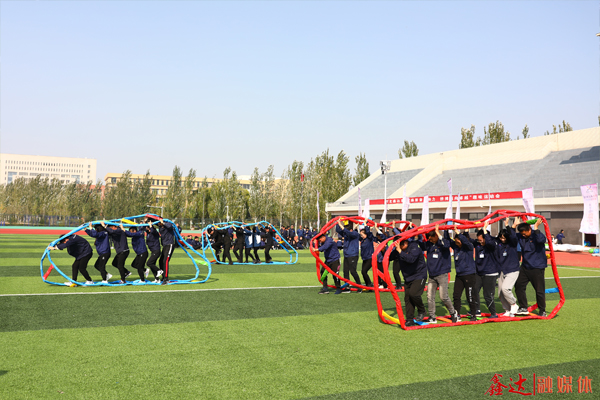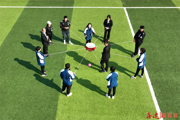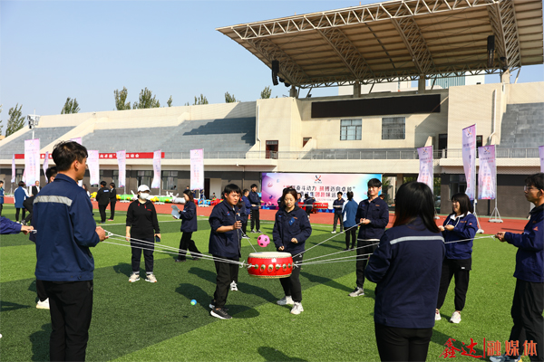 同心击鼓项目中,运动员默契配合,同心协力将鼓腾空,击鼓颠球,将鑫达人心往一处想、劲往一处使、眼往一处看的精神体现得淋漓尽致。